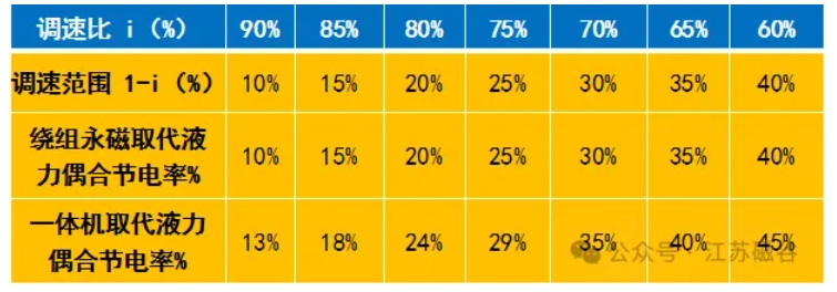 1)繞組永磁調速同工況取代液力偶合調速器節電率見下表: